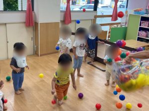 次はボール遊び!ビニールプールに集めて上からざざーっ