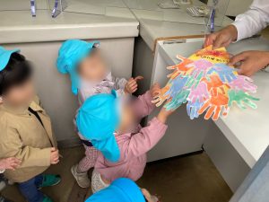 もうすぐ勤労感謝の日ということで、交番へいつもありがとうのプレゼントとして製作した花束を渡しに行きました💐