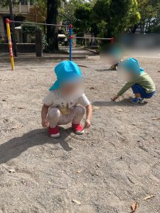 こっちの2人は、めばえ組の男の子2人で仲良く石を拾ったり木の棒を持ったり…